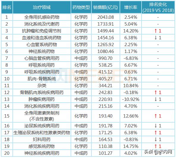 米内网数据显示,中国公立医疗机构终端中,化学药分为14个治疗大类,90个治疗亚类,5100多个通用名品种;中成药分为13个治疗大类,74个治疗亚类,6000多个通用名品种。
