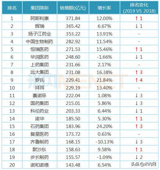 与2018年相比,2019年销售额TOP20医药集团名单不变,但排名出现不小变化。阿斯利康反超辉瑞,以371.83亿元的销售额排位第一;曲妥珠单抗、利妥昔单抗、贝伐珠单抗放量明显,罗氏凭借这“三驾马车”上升4个名次至第9位;远大集团、石药集团均上升3个名次,分别排在第8位、第15位。