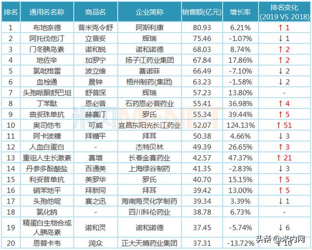 在鼓励创新及抗癌药医保谈判作用下,罗氏的赫赛汀、美罗华及安维汀、石药的恩必普、扬子江的加罗宁等放量明显;由于流感频发,东阳光药的可威增速迅猛,增长率高达124.13%,排名由2018年的61位上升至2019年的第10位。