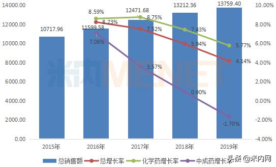2019年中国城市公立医院、县级公立医院、城市社区中心以及乡镇卫生院(简称中国公立医疗机构)终端药品销售额为13759.4亿元,同比增长4.14%,市场逐年扩容,但增速持续放缓。其中化学药销售额10929.22亿元,同比增长5.77%;中成药销售额2830.18亿元,同比下滑1.7%。